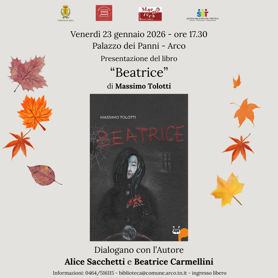 "Beatrice" è il libro d'esordio dello scrittore arcense Massimo Tolotti, con il quale ha voluto creare un ponte tra generazioni diverse, con lo scopo di evocare nel lettore le sensazioni di spensieratezza e incertezza tipiche dell’infanzia e dell’adolescenza. L'autore dialogherà con Alice Sacchetti e Beatrice Carmellini. L'ingresso è libero.