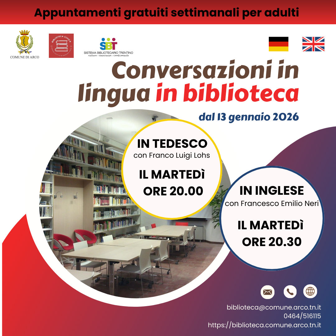Continuano gli appuntamenti serali in biblioteca di conversazione in lingua straniera. Il martedì sera, a cadenza settimanale, si incontreranno 2 gruppi condotti da un insegnante di madrelingua inglese e tedesca. La partecipazione è gratuita ma la prenotazione è consigliata.