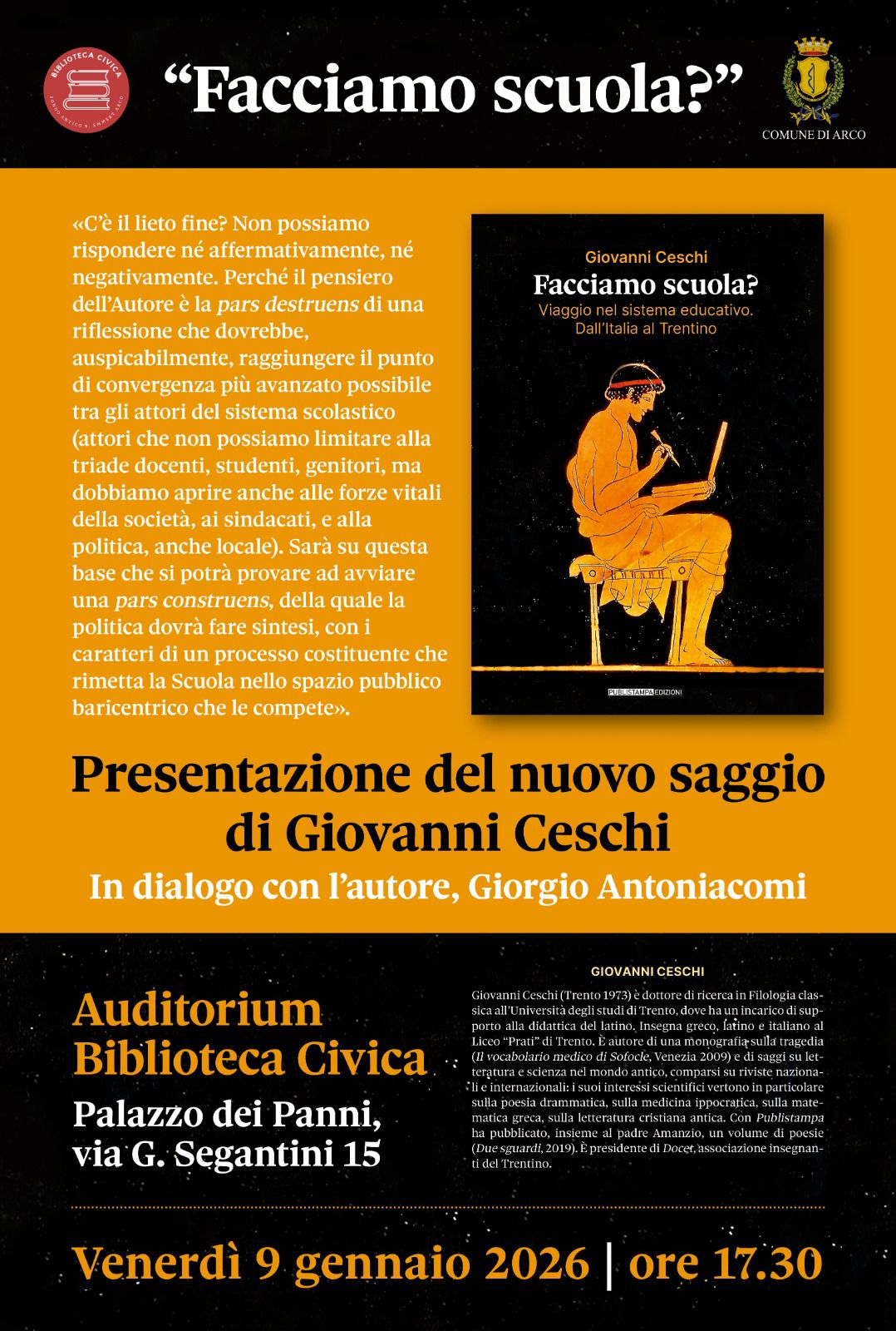 Venerdì 9 gennaio 2026, ore 17.30 si terrà la presentazione del libro "Facciamo scuola? Viaggio nel sistema educativo dall'Italia al Trentino" di Giovanni Ceschi, docente e presidente dell'Ass. Docet. Dialoga con l'autore Giorgio Antoniacomi.