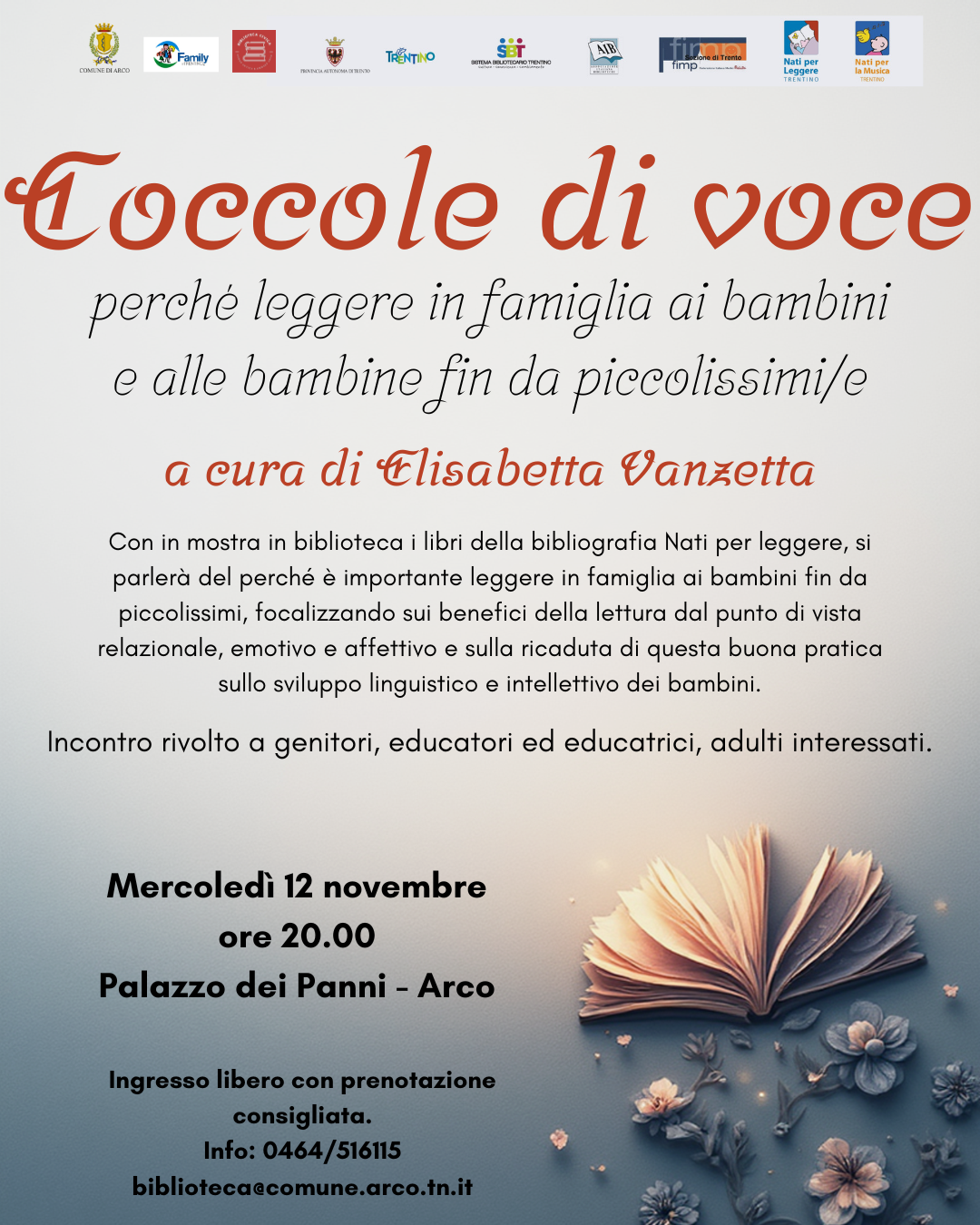 Con l'occasione della mostra bibliografica Nati per Leggere in biblioteca proponiamo una serata dedicata a genitori, educatori ed adulti interessati con Elisabetta Vanzetta. "Coccole di voce: perché leggere in famiglia ai bambini e alle bambine fin da piccolissimi" è il tema dell'incontro che sarà mercoledì 12 novembre 2025 alle ore 20.00. La prenotazione è consigliata.