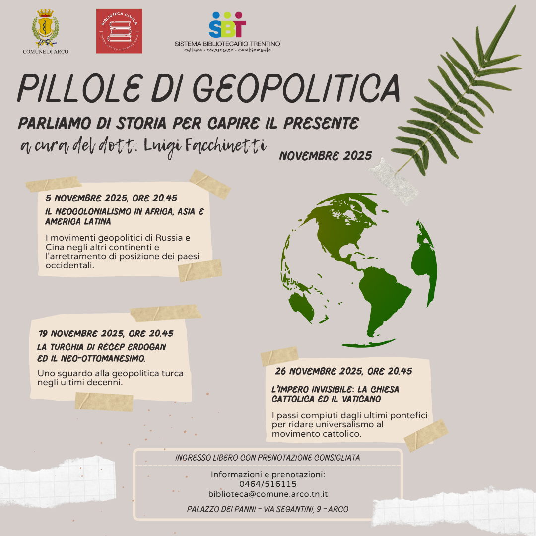 Continuano anche nel mese di novembre gli apprezzati appuntamenti di storia e geopolitica, a cura del dottor Luigi Facchinetti: "Pillole di geopolitica. Parliamo di storia per capire il presente". Mercoledì 5 novembre alle ore 20.45, si parlerà di Neocolonialismo: i movimenti geopolitici di Russia e Cina negli altri continenti e l'arretramento di posizione dei paesi occidentali. Ingresso libero con prenotazione consigliata.