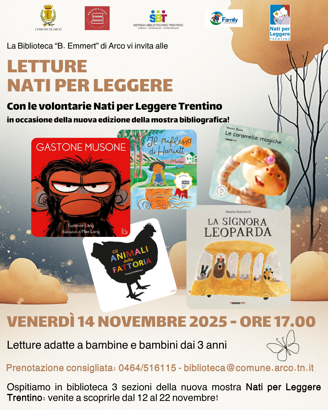 La biblioteca ospita la mostra bibliografica Nati per Leggere Trentino e venerdì 14 novembre le volontarie Adriana, Alice e Tania leggeranno tante belle storie. Aspettiamo bambine e bambini, con genitori, nonni e amici, in biblioteca! La prenotazione è consigliata.