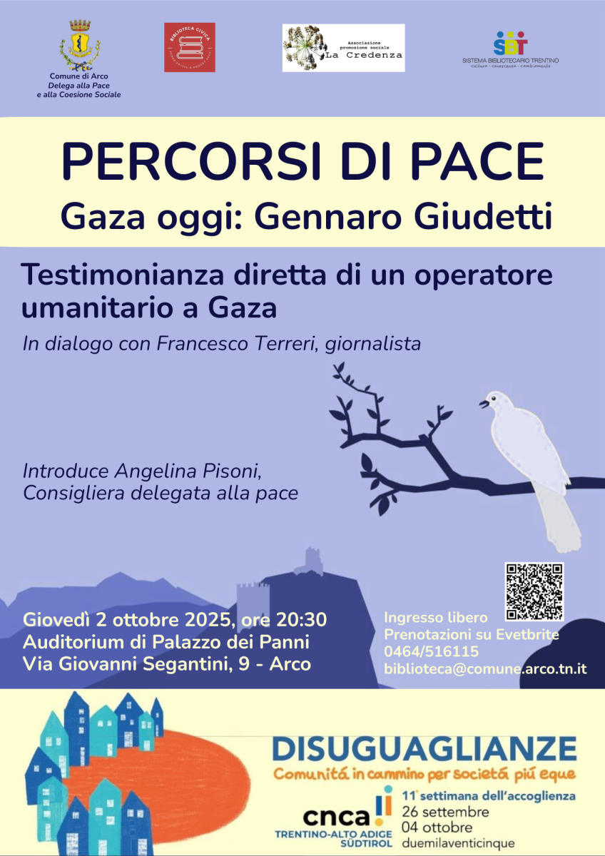 Il secondo appuntamento di "Percorsi di Pace", rassegna proposta dalla consigliera con delega alla pace e alla coesione sociale Angelina Pisoni, fa parte del programma dell'undicesima edizione della Settimana dell'accoglienza organizzata dal Coordinamento nazionale comunità di accoglienza (Cnca), federazione del Trentino Alto Adige. La settimana dell'accoglienza, il cui programma è consultabile a questo link, si svolge dal 26 settembre al 4 ottobre 2025 su tutto il territorio regionale, coinvolge moltissimi enti ed associazioni e quest'anno è dedicata al tema "Disuguaglianze. Comunità in cammino per società più eque".