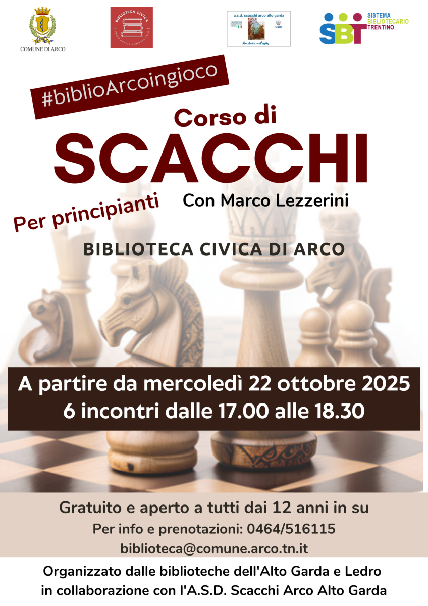 Il corso è organizzato dalle biblioteche dell'Alto Garda e Ledro e in collaborazione con l'A.S.D. Scacchi Arco Alto Garda.