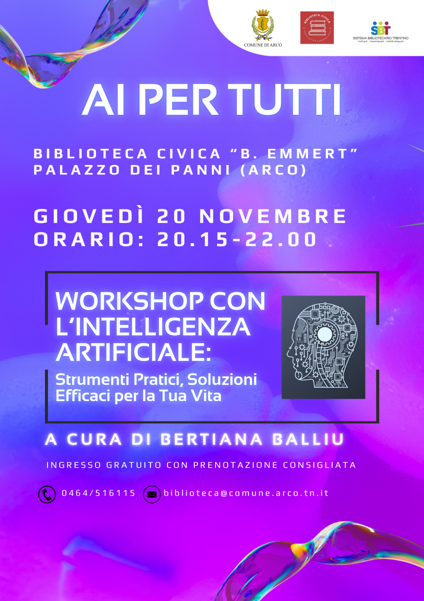In questo appuntamento si lavorerà in un workshop con l'Intelligenza artificiale: "Strumenti pratici e soluzioni efficaci per la tua vita". Sarà inoltre necessario portarsi un proprio device a scelta (smartphone. tablet o portatile).