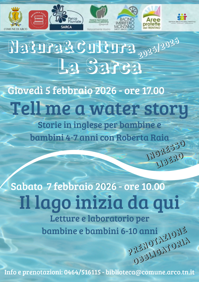 Sabato 7 febbraio 2026 ore 10.00 Laboratorio "Il lago inizia da qui": letture e laboratorio per bambine e bambini dai 6 ai 10 anni. Prenotazione obbligatoria al numero 0464/516115 o via mail a biblioteca@comune.arco.tn.it