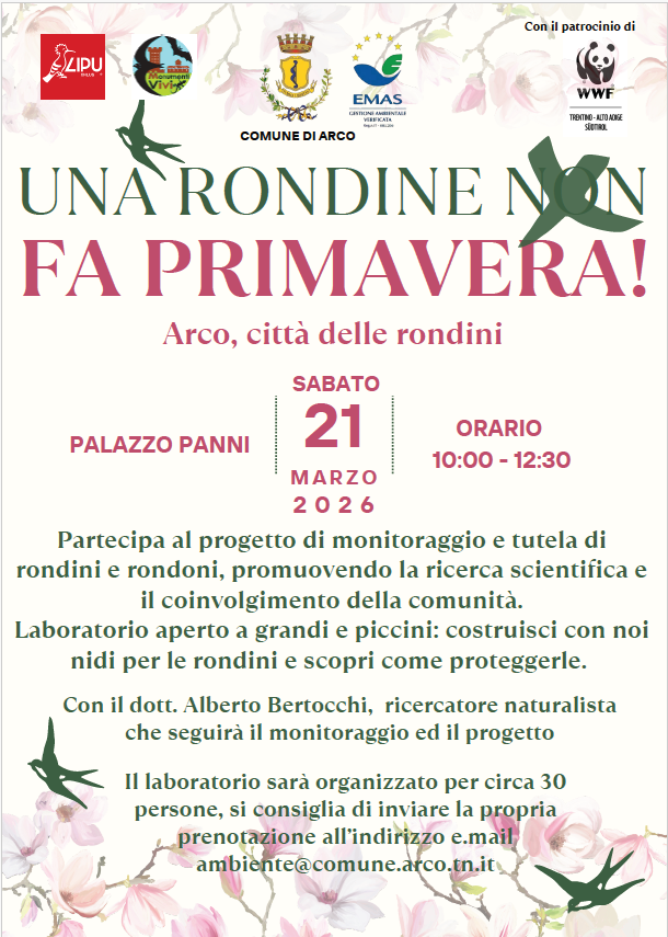L’evento, dal titolo «Una rondine [non] fa primavera», proporrà sia un laboratorio aperto a grandi e piccini di costruzione di nidi per le rondini, sia un momento informativo sulle rondini, sulla loro utilità per l’uomo e sui modi con cui ognuno può contribuire a tutelarle, il tutto con la conduzione del dott. Alberto Bertocchi, ornitologo, ricercatore e naturalista, incaricato dal comune di Arco della redazione e gestione del progetto «Arco città delle rondini».