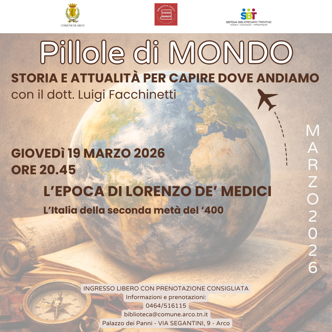 L'appuntamento di marzo con "Pillole di mondo. Storia e attualità per capire dove andiamo" con il professor Facchinetti è dedicato a Lorenzo de' Medici. L'ingresso è libero, con prenotazione consigliata al numero 0464/516115 o via mail a biblioteca@comune.arco.tn.it