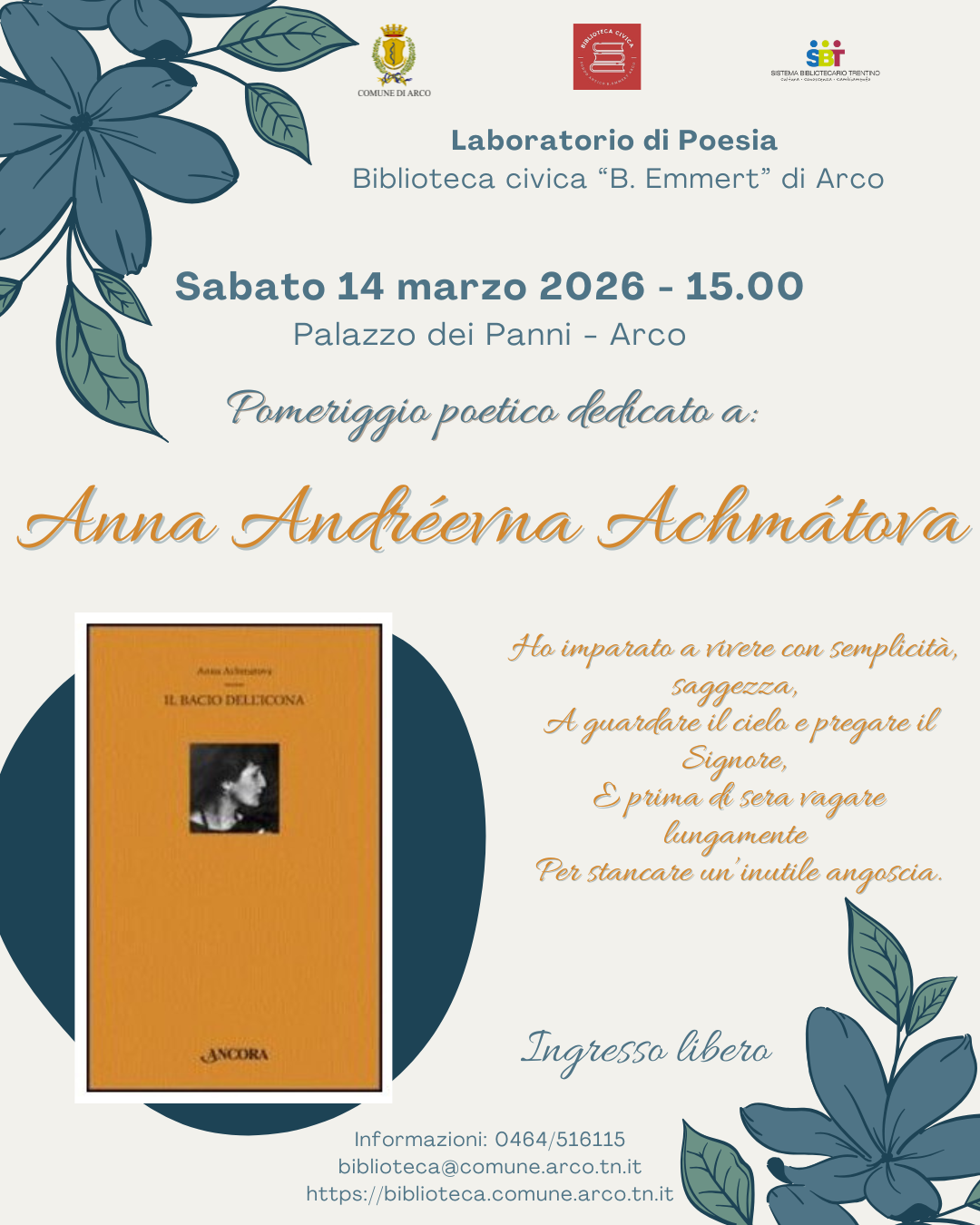 Il laboratorio di poesia della biblioteca dedica un appuntamento alla poeta Anna Andreevna Achmatova, sabato 14 marzo dalle 15.00 alle 18.00. L'ingresso è libero a tutti gli interessati.