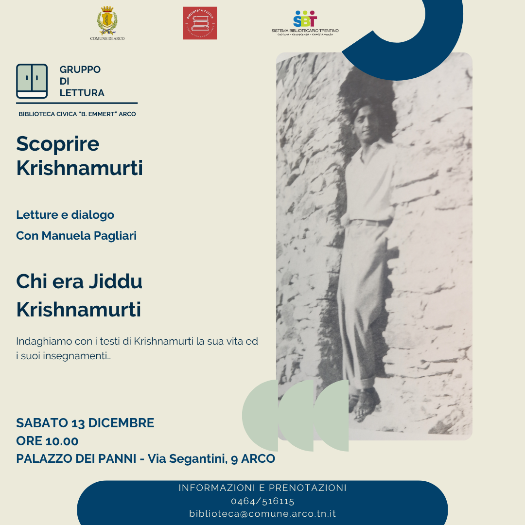 Riprendono gli appuntamenti mensili del gruppo di lettura sui testi di Jiddu Krishnamurti: sabato 13 dicembre alle ore 10.00 Manuela Pagliari dialogherà con i partecipanti sulla vita e gli insegnamenti del filosofo Krishnamurti.