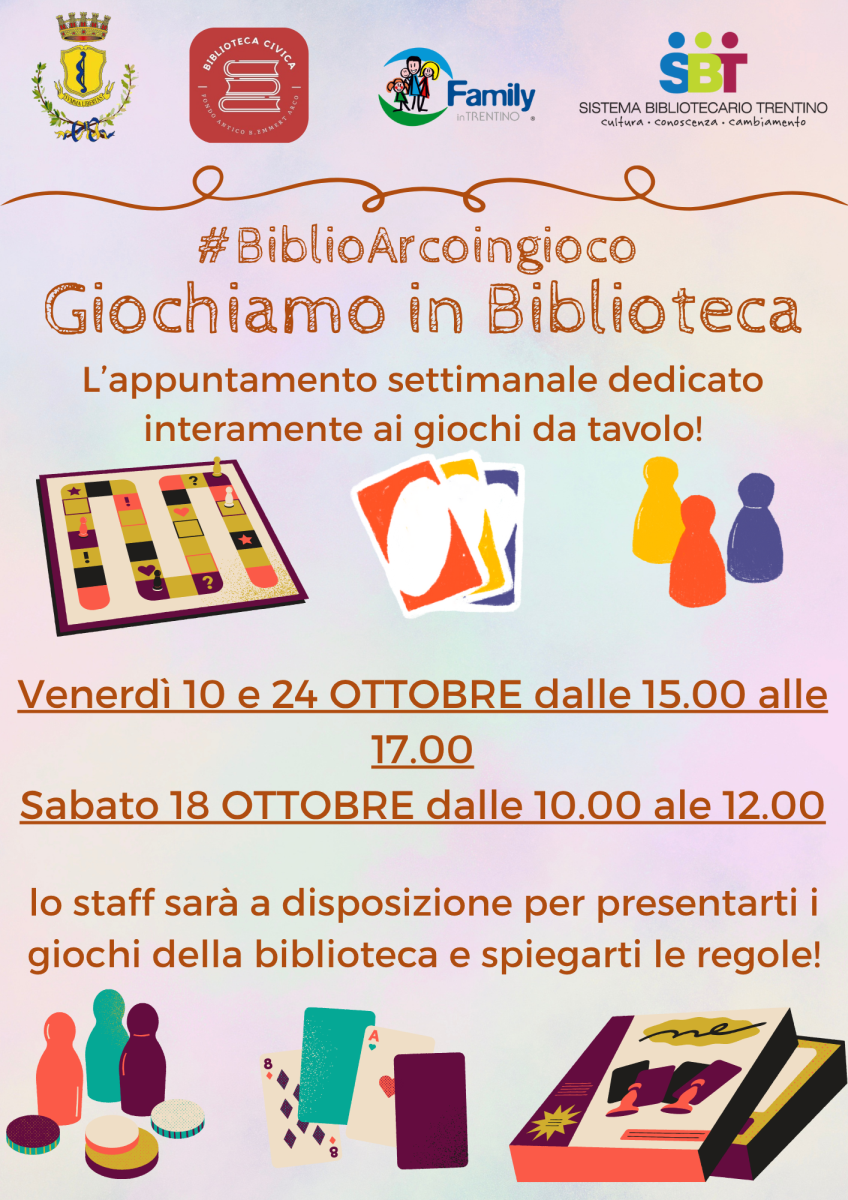 Il venerdì, ed ora anche il sabato, verrà riservata una sala dedicata tutta al gioco. Il nostro staff è a disposizione dalle 15.00 alle 17.00 il venerdì e dalle 10.00 alle 12.00 il sabato, per presentare e spiegare le regole in modo da entrare subito nel mondo dei giochi da tavolo! Venite in biblioteca a giocare!