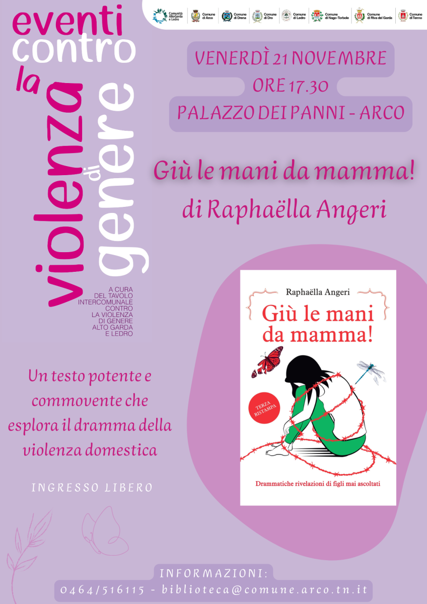 Il Comune di Arco propone venerdì 21 novembre all’auditorium di Palazzo dei Panni la presentazione del libro di Raphaëlla Angeri «Giù le mani da mamma!», un testo potente e commovente che esplora il dramma della violenza domestica. Lo stesso giorno al Centro giovani intercomunale Cantiere 26 si terrà lo spettacolo «Lidia. Storie di una masca» della compagnia Salz, appuntamento di apertura della rassegna Teatro Cantiere (ore 20.45). Sempre al Cantiere 26 per la rassegna Teatro Cantiere, mercoledì 26 novembre la proposta sarà «Tomato Soap», spettacolo di Manimotò (ore 20.45) che porta in scena il tema della violenza di genere raccontando la storia di un uomo e di una donna che pensano di darsi amore e si danno morte. Ancora al Cantiere 26, giovedì 27 novembre a partire dalle 19, aperitivo del venerdì contro la violenza di genere in collaborazione con il Gruppo di lettura femminista dell’associazione Andromeda e dj set.