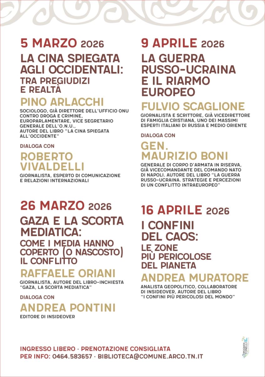 Ingresso libero con prenotazione consigliata su Eventbrite, a questo link, oppure chiamando in biblioteca al numero 0464/516115 o scrivendo a biblioteca@comune.arco.tn.it
