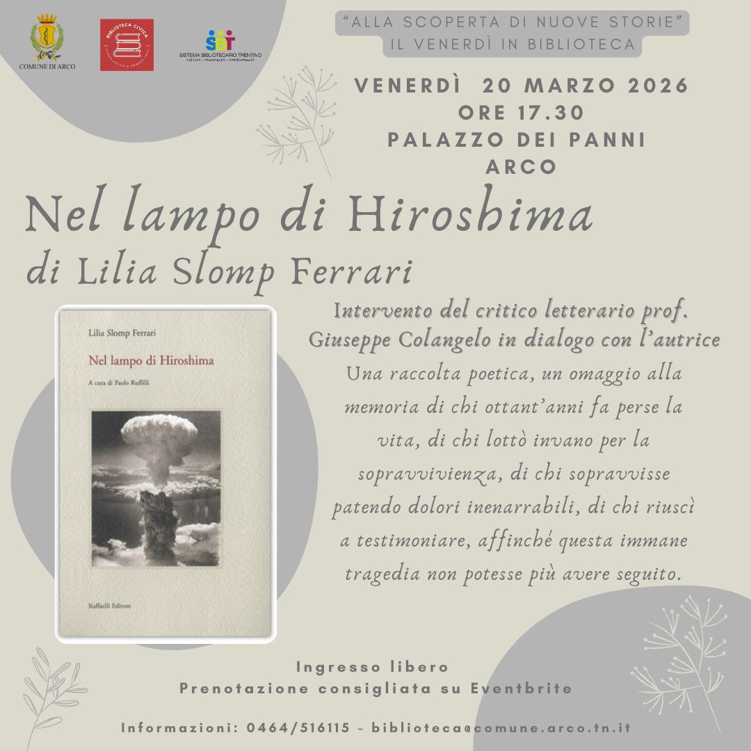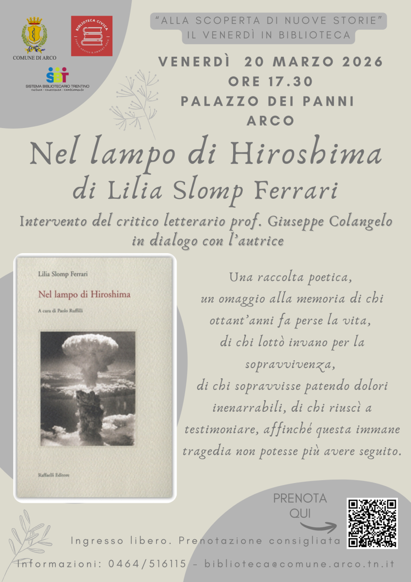 L'evento è ad ingresso libero, ma consigliamo la prenotazione su Eventbrite, a questo link, oppure chiamando in biblioteca il numero 0464/516115 o scrivendo a biblioteca@comune.arco.tn.it